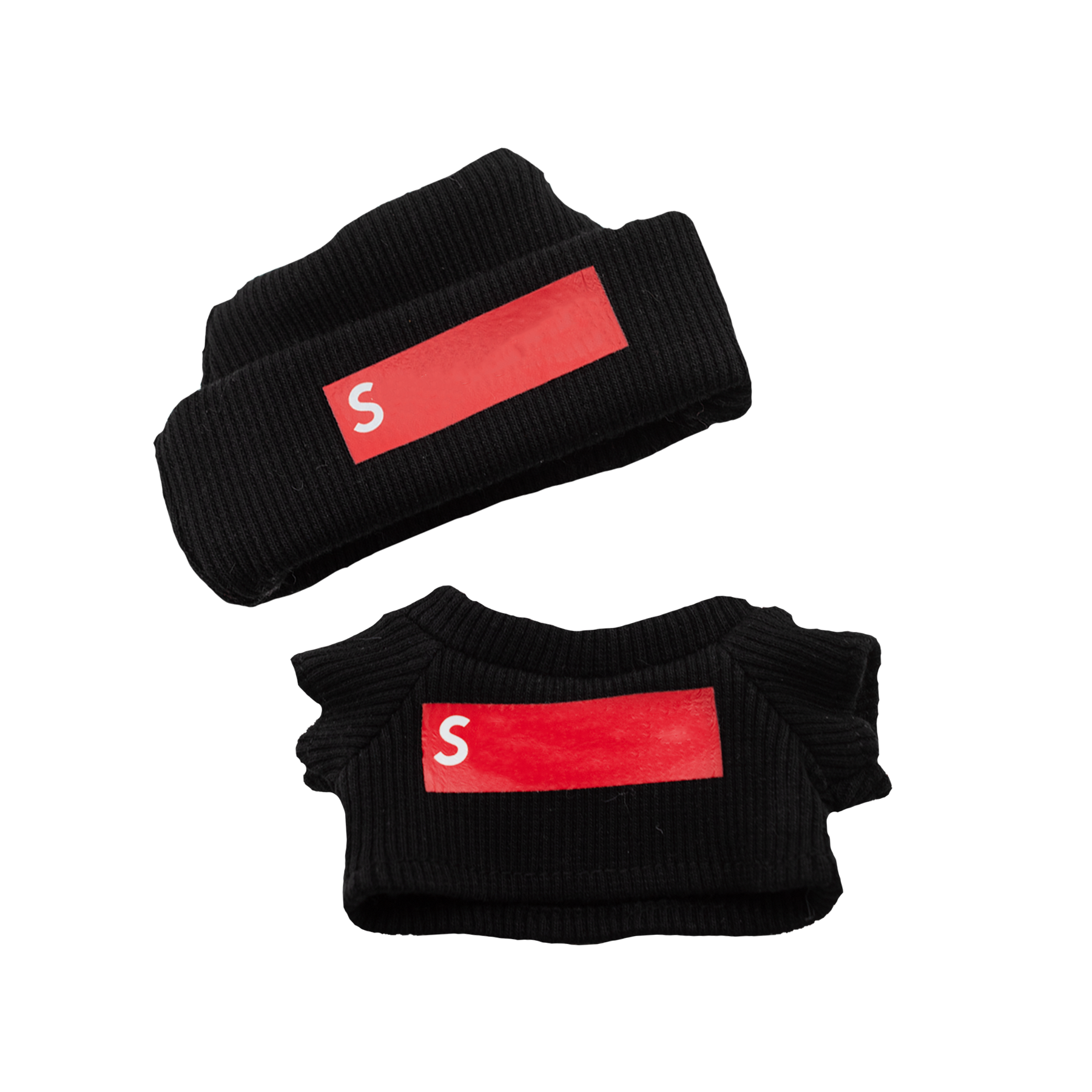 • Includes black ribbed beanie and matching top with red label design